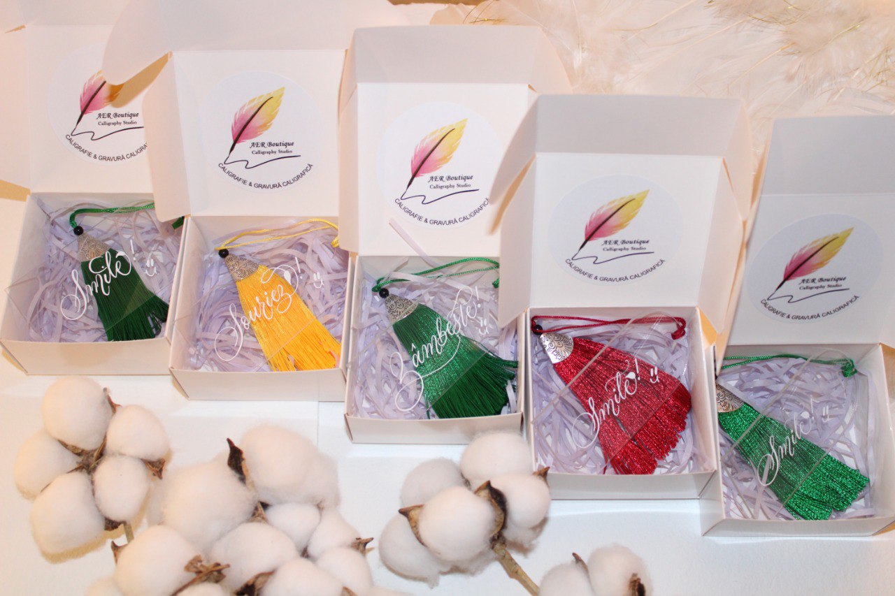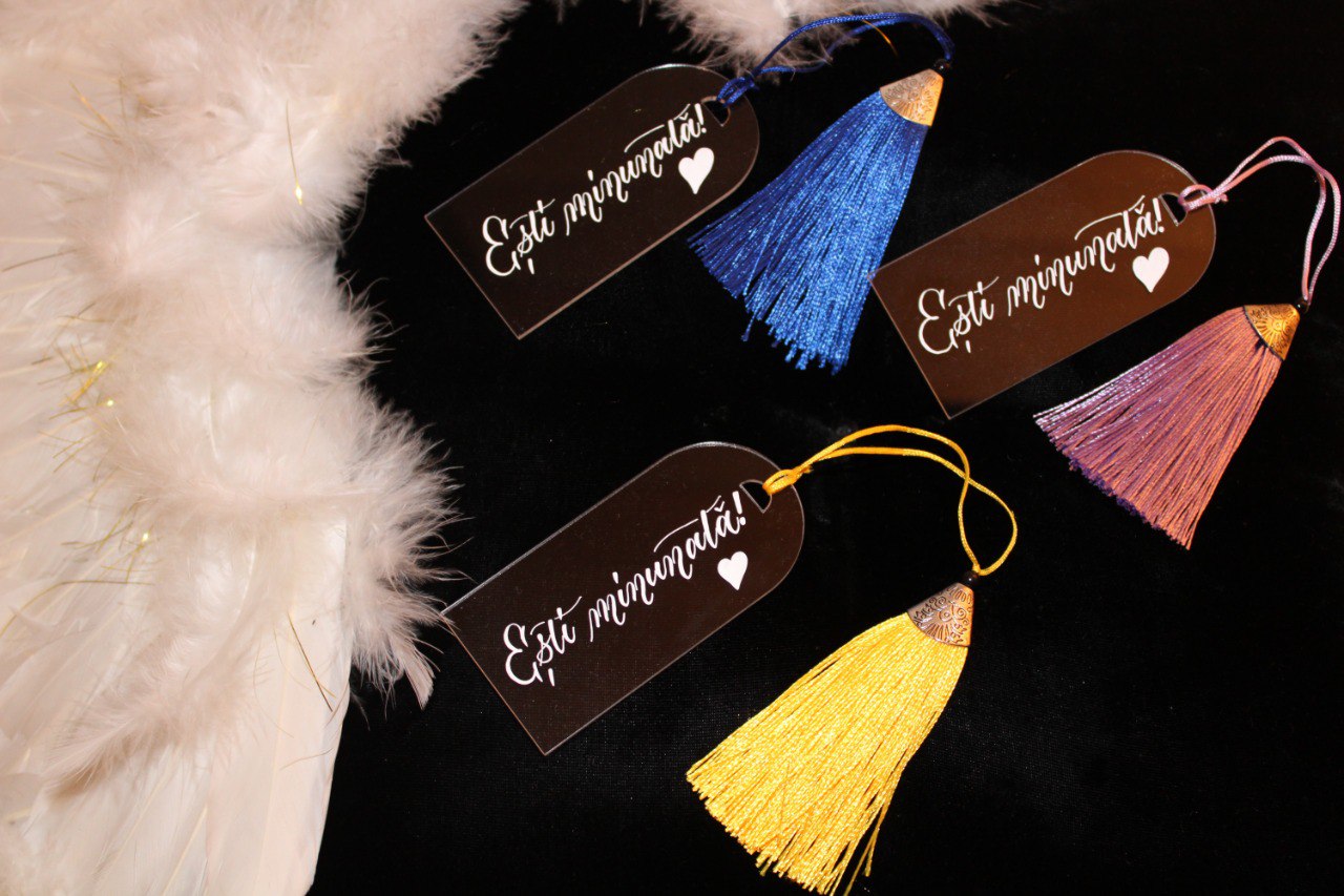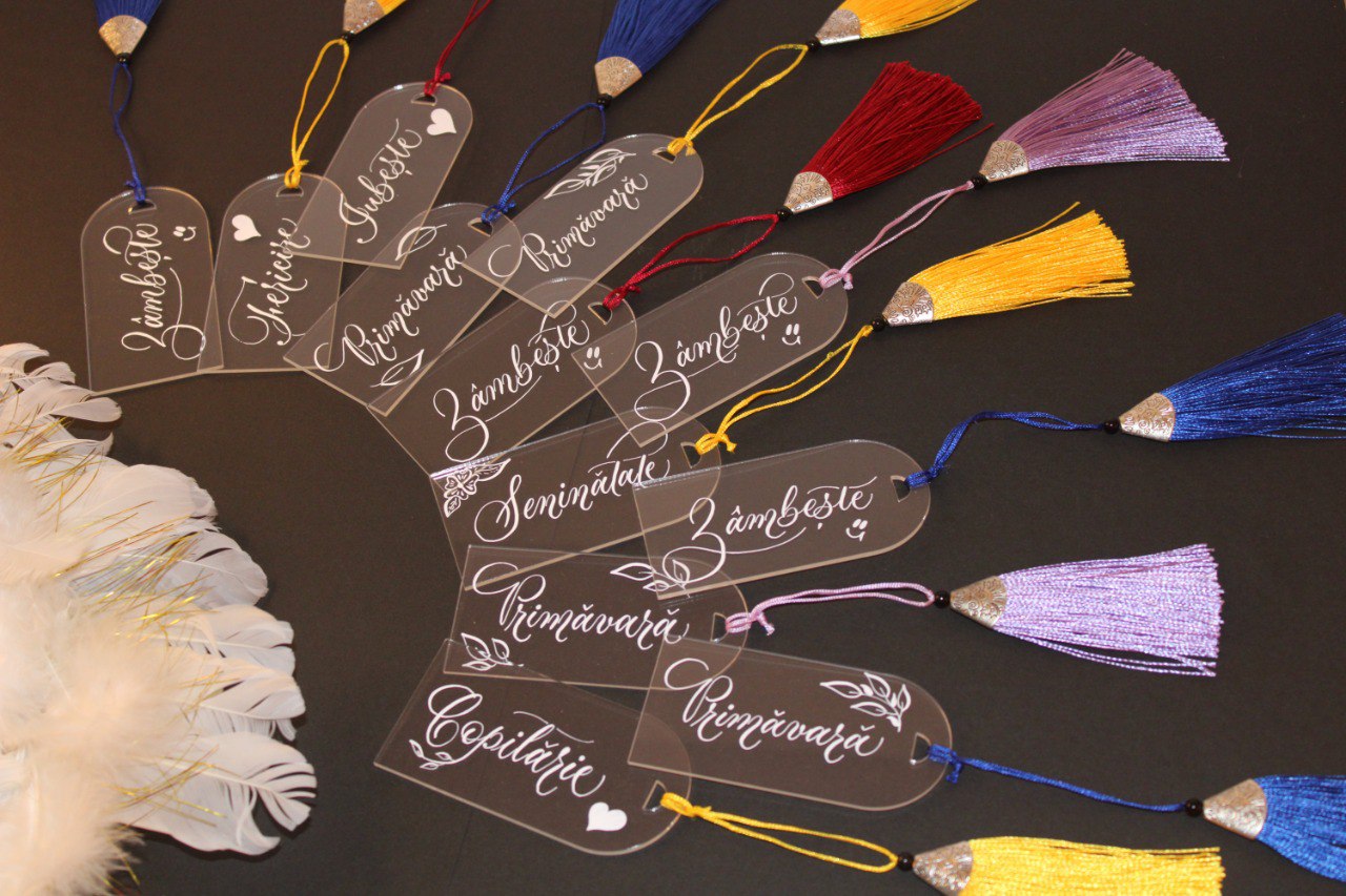 Cât despre mărțișoarele semne de carte, pot spune că acestea sunt din plexiglas, scrise de mână cu cerneală albă și decorate cu panglică de mătase și iz elegant.