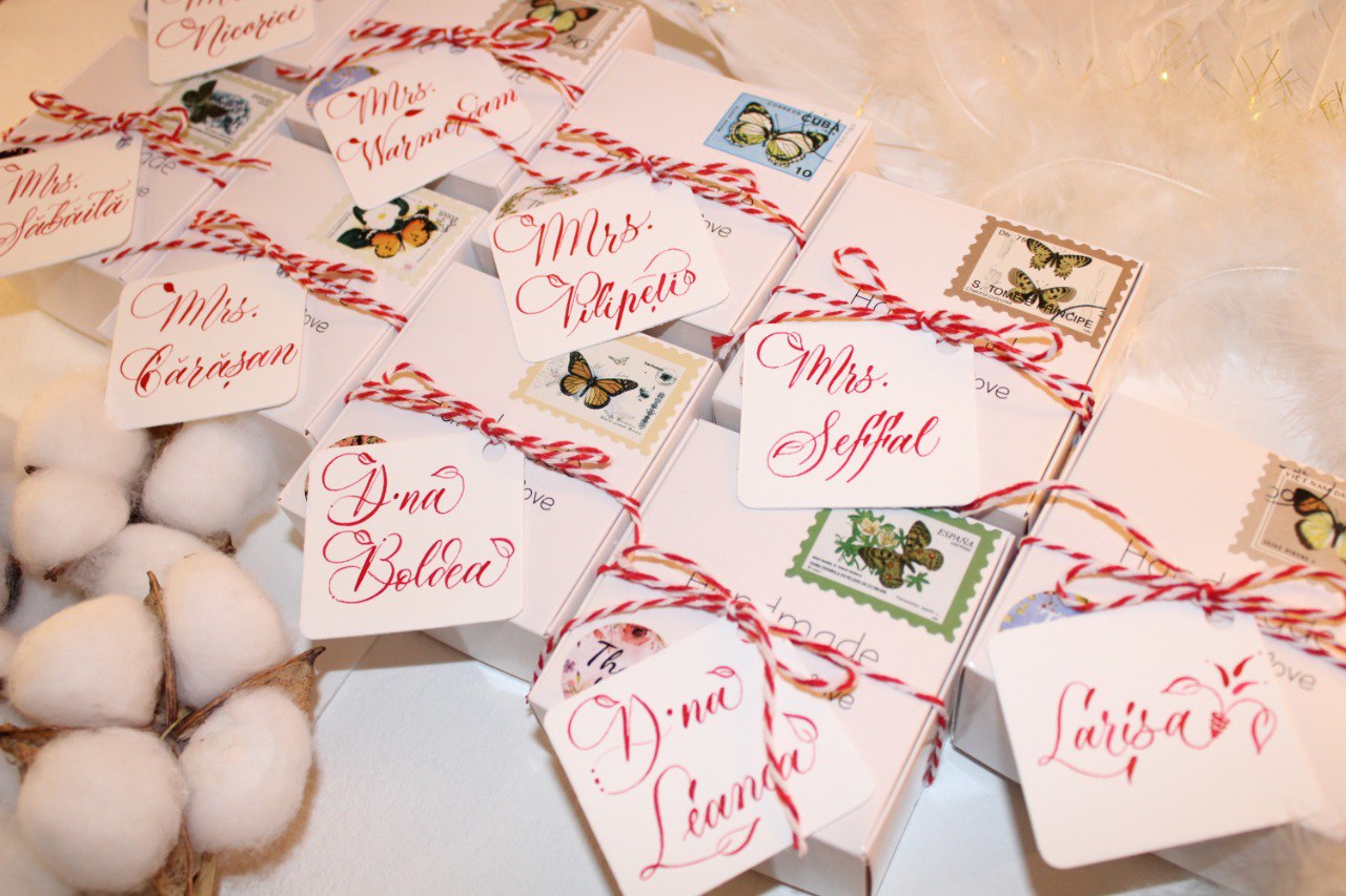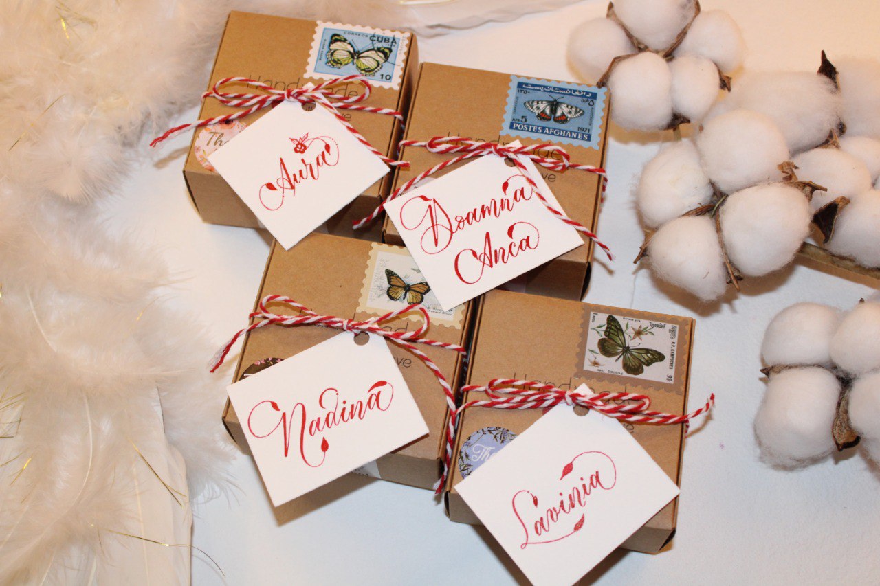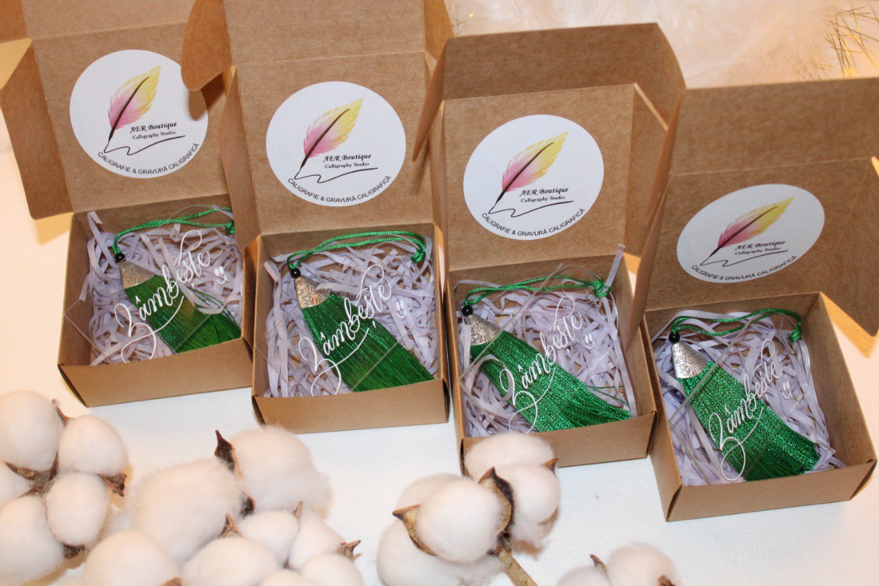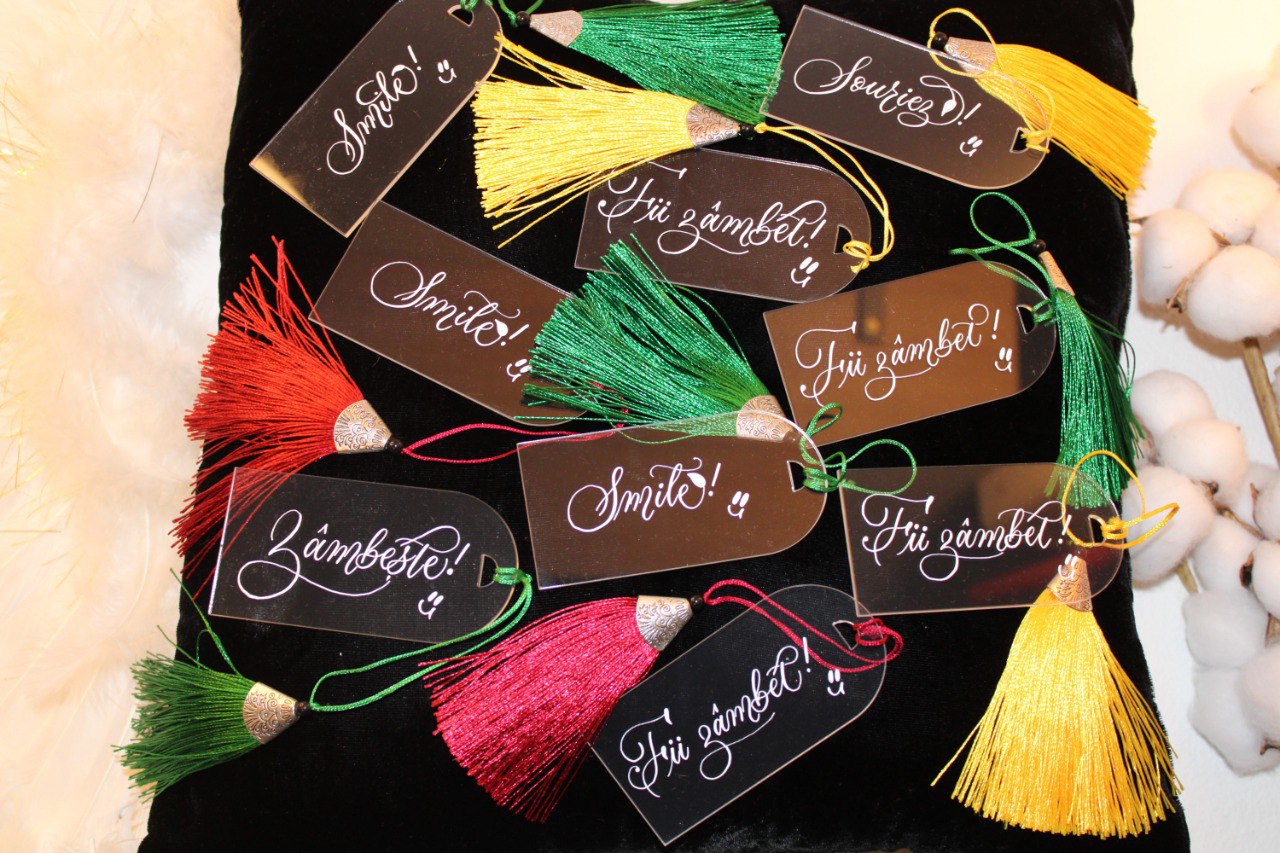 Cât despre mărțișoarele semne de carte, pot spune că acestea sunt din plexiglas, scrise de mână cu cerneală albă și decorate cu panglică de mătase și iz elegant.